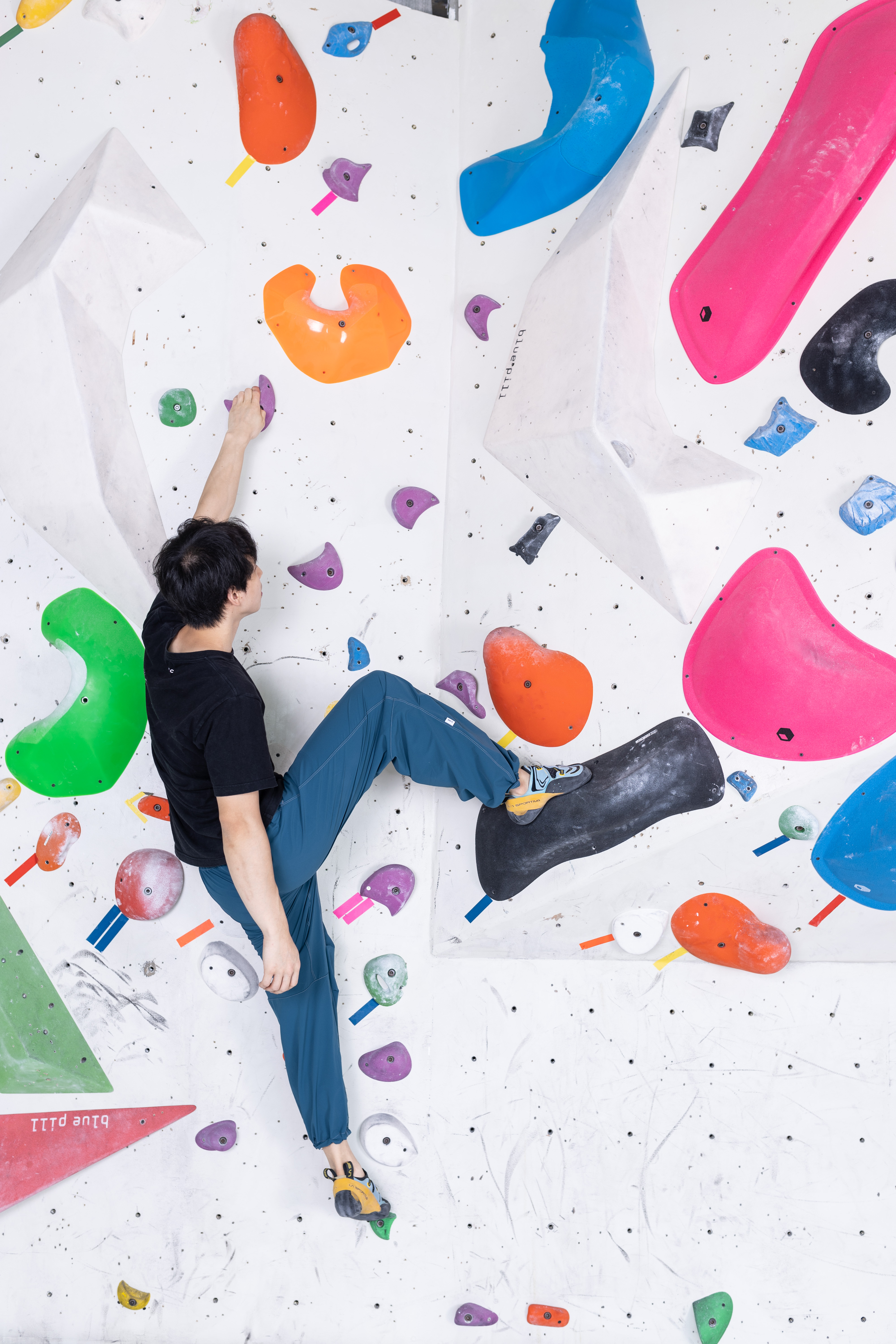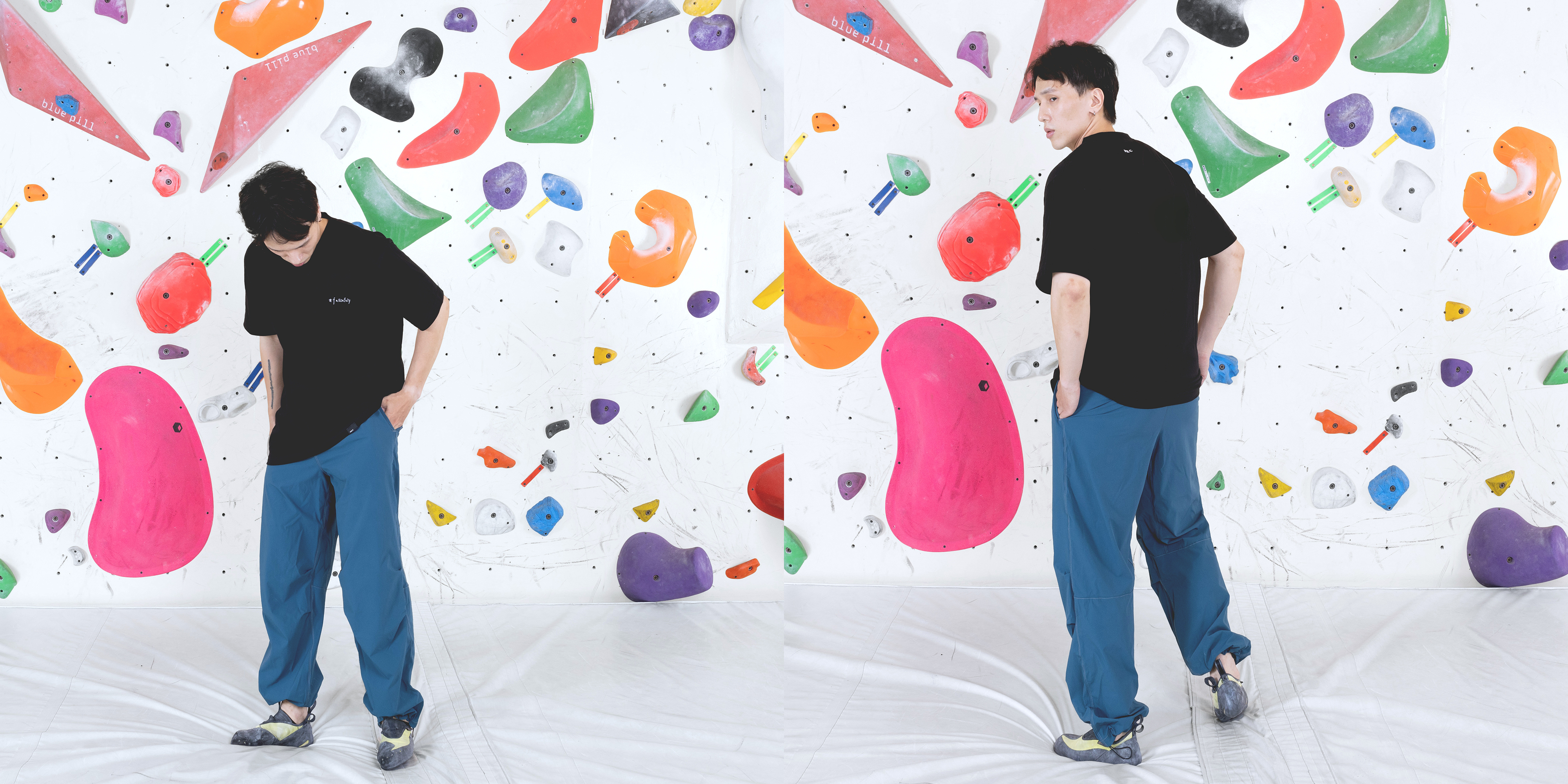 台灣製四向彈高機能布料以及胯下及膝蓋預折的3D剪裁,使得活動度大增,無論穿著任何自己想要的風格尺寸,攀岩時都不會形成阻礙。(本圖以黑色款式褲子為示範)